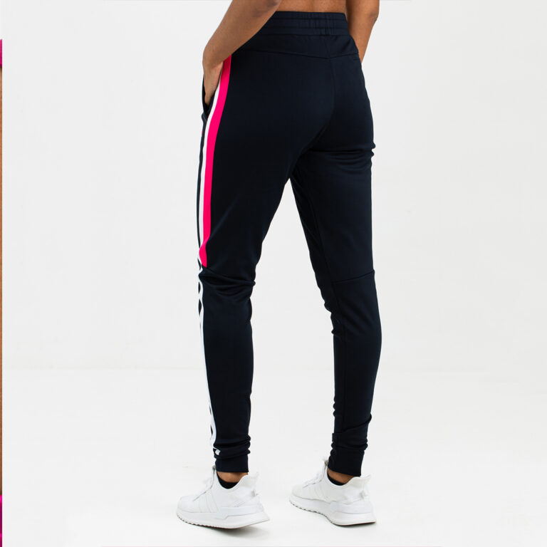 Glatte, dunkelblaue Multisporthose für Damen. Diese schöne Trainingshose hat Bündchen an den Knöcheln und ist aus Power-Stretch-Material gefertigt. Entlang der Seitennähte verläuft ein Kontraststreifen in Weiß und auf der oberen Hälfte in Rosa. Die Hose hat Seitentaschen und eine Gesäßtasche mit Reißverschluss.