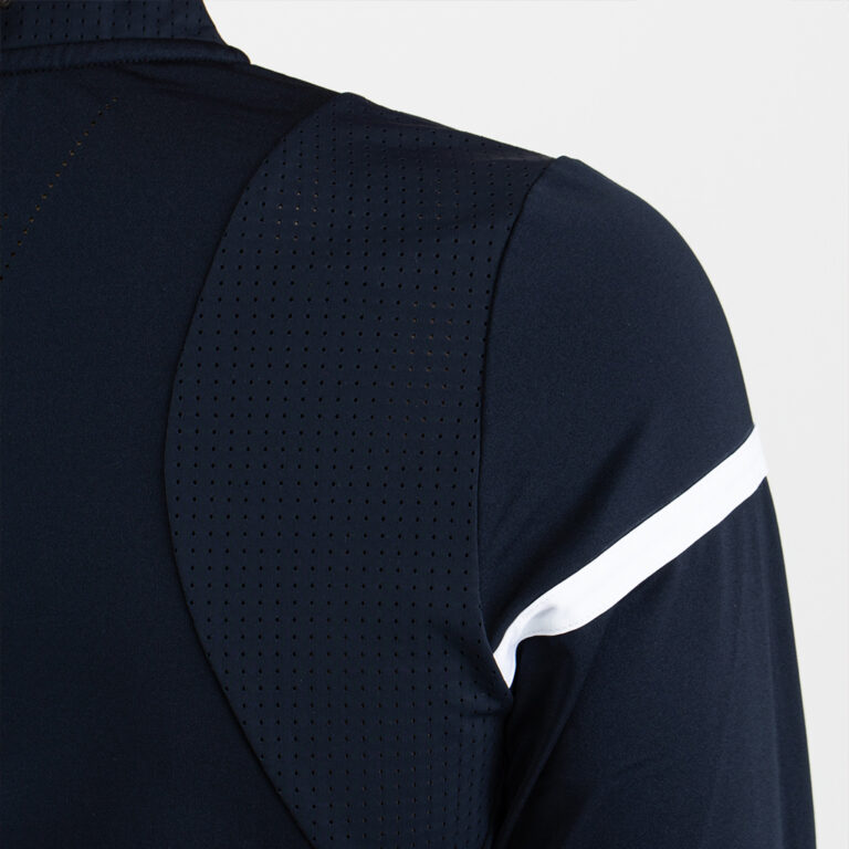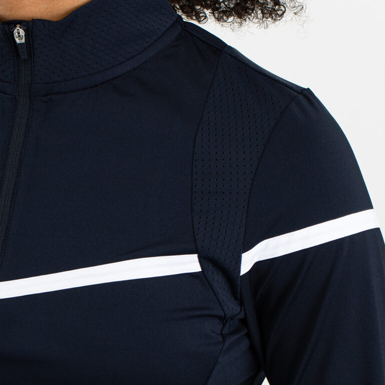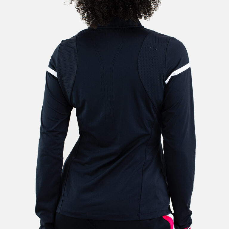 Sportief dames shirt met lange mouwen en een halsopening met ritssluiting. Dit shirt is gemaakt van donkerblauwe single jersey met een witte bies over de borst en bovenarmen en mouwboorden met een roze, mint en witte streep. Aan de achterkant zit in het midden perforatie.