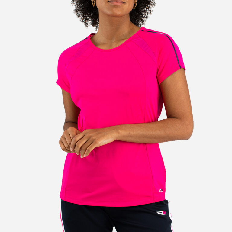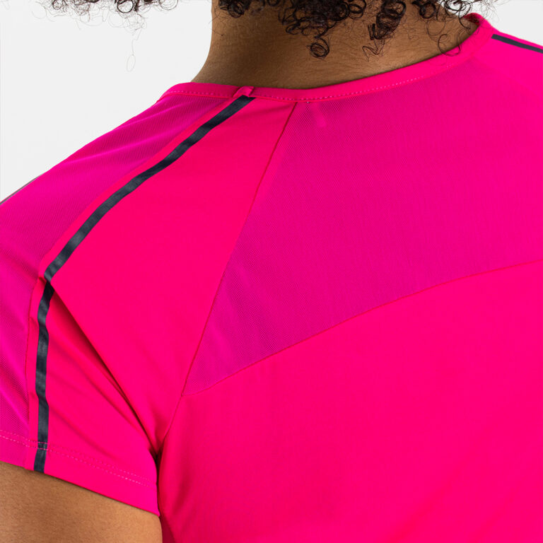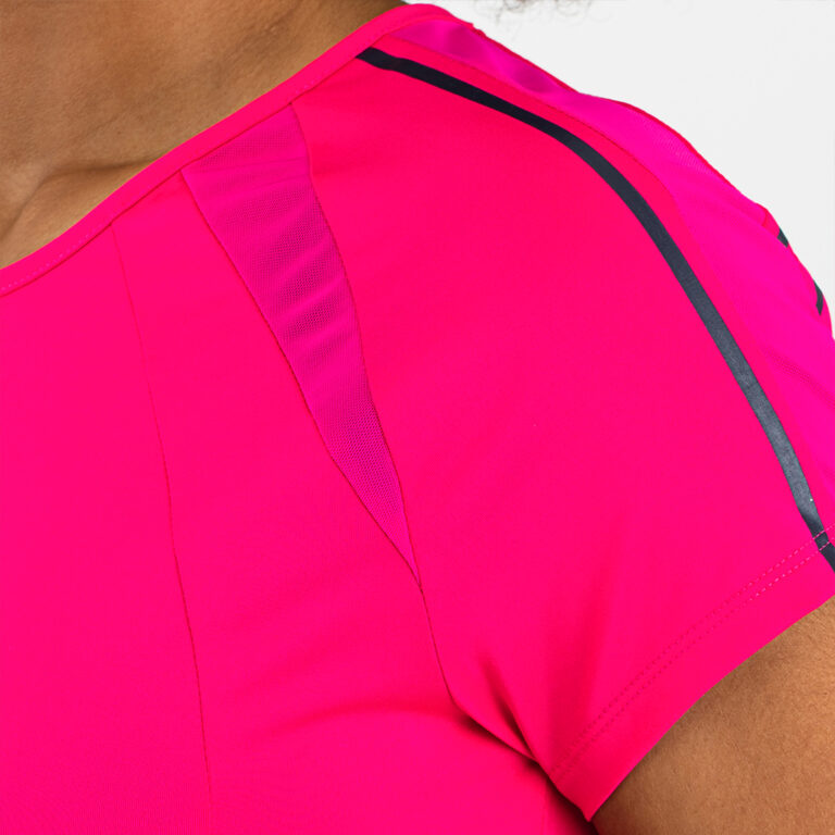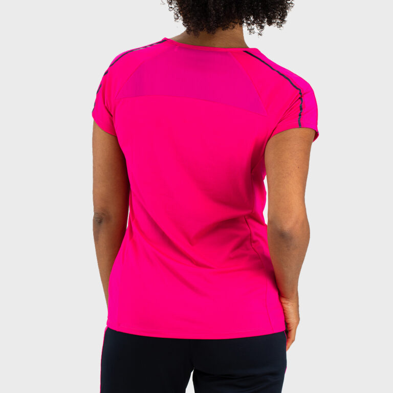 Roze dames t-shirt met luchtige inzetten van mesh stof bovenaan de rug en bij de mouwen. Dit fijne, sportieve t-shirt is gemaakt van single jersey en langs de schouders loopt een bies van donkerblauwe seal-on tape.