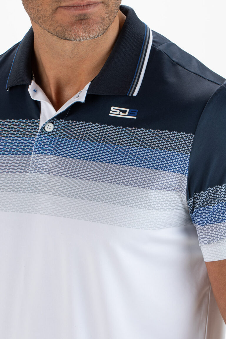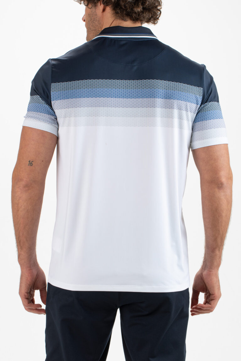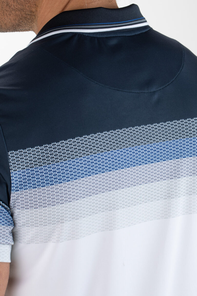 Modieus heren poloshirt van fijne, elastische, piqué gebreide stof. Deze donkerblauw met witte polo valt op door de inzetten met opdruk bovenaan. Langs de donkerblauwe kraag lopen contrasterende strepen.