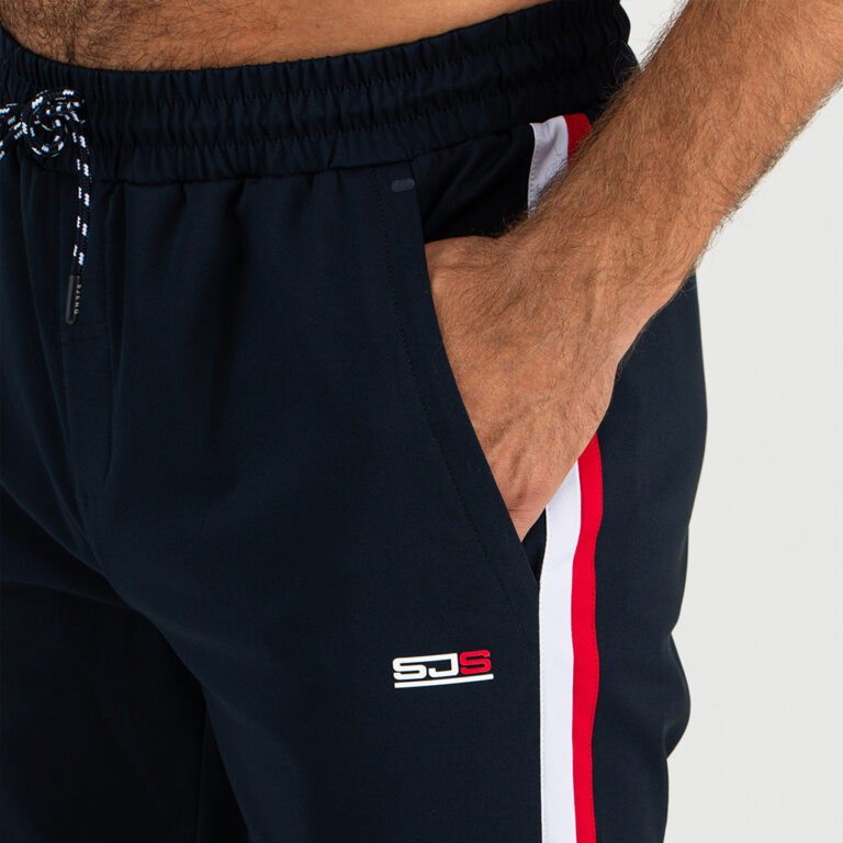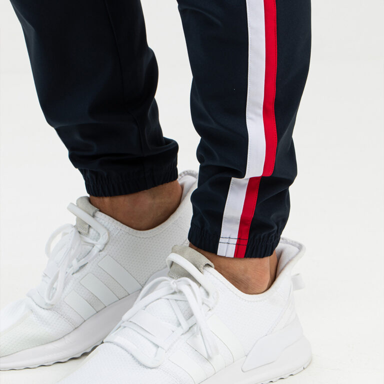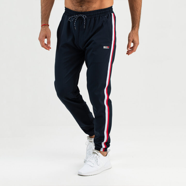 Comfortabele multi sport broek voor heren. Deze donkerblauwe broek is gemaakt van geweven stretch materiaal en hij heeft elastische boorden bij de enkels. Langs de zijnaden loopt een contrasterende rood met witte bies en de broek heeft een achterzak met ritssluiting.