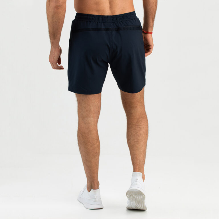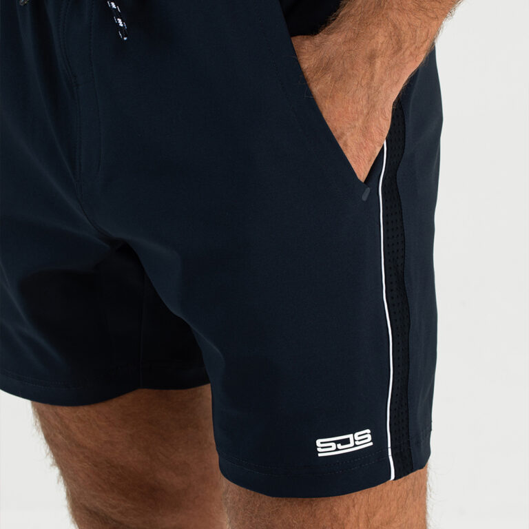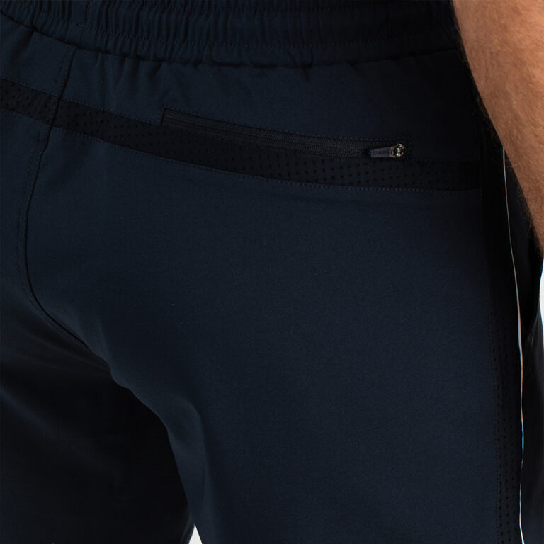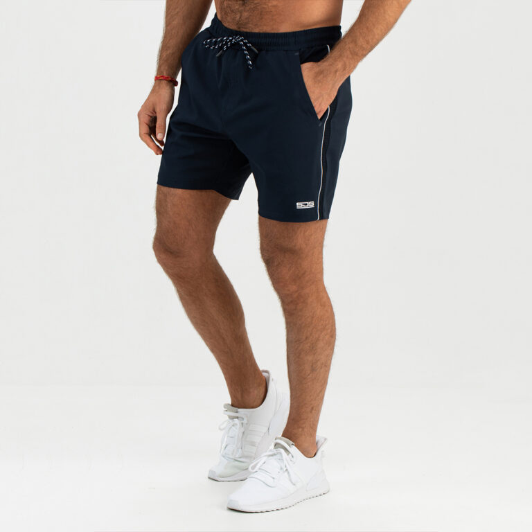 Sportief multi sport short voor heren. Deze short is gemaakt van donkerblauw geweven stretch materiaal met een witte bies langs de zijnaden. Hij heeft inzetten van power mesh materiaal, twee steekzakken en een achterzak met ritssluiting.